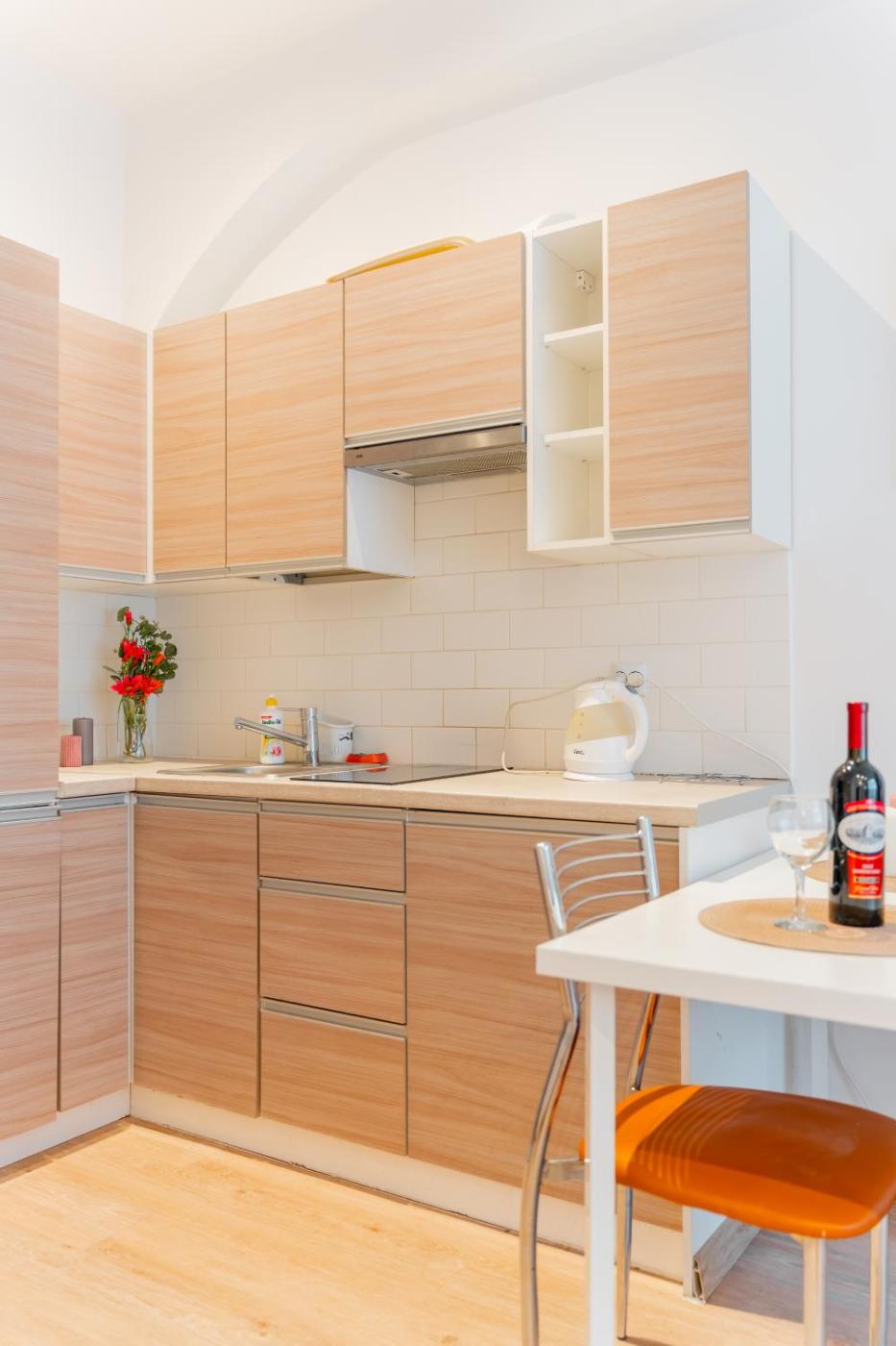 Studio. The studio features a seating area, a dining area, as well as a private bathroom boasting a shower and a hairdryer. In the well-fitted kitchenette, guests will find a stovetop, a refrigerator, kitchenware and an electric kettle. This studio has a washing machine, a private entrance, flat-screen TV with streaming services, as well as chocolate for guests. The unit has 1 bed. Studio - 2 osobowy. Powierzchnia pokoju ok.: 20 mkw.